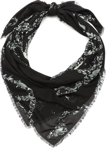 Eyelash fringe frames this lithe scarf flush with soaring birds, peace signs and a bold logo.