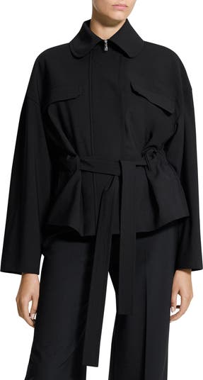 An attached tie waist and elastic back waistband shape this stretch-wool jacket balancing structure with a polished, sophisticated finish.