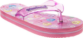 - Sweet Style with Candy Hearts: These Sweethearts girls shoes feature the classic "Love Bug," "Kiss Me," and "Bestie" candy heart designs; these girls flip flops bring a nostalgic and fun vibe to her summer wardrobe with a vibrant pink and purple color palette.