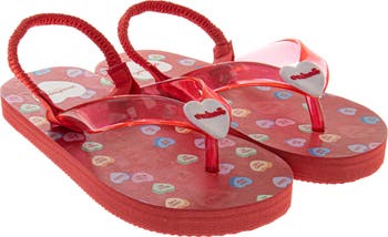 - Sweet Style with Candy Hearts: These Sweethearts girls shoes feature the classic "Giggle," "Wink Wink," and "Crush On U" candy heart designs; these girls flip flops bring a fun and nostalgic vibe to her summer wardrobe with a bold red and white color palette.
