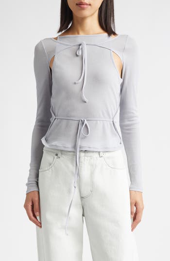 This layered top cut from superfine rib creates the illusion of an open-front cardigan over a high-neck camisole but is cleverly constructed as one piece. The lightweight design that ties in front displays the label's unconventional and experimental approach to knitwear.
