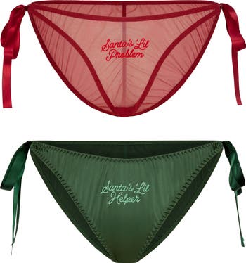 This sultry set includes one satin panty embroidered with "Santa's 'Lil Helper" and one sheer tulle panty embroidered with "Santa's 'Lil Problem." Both styles feature sexy satin ribbon ties at the sides and flattering shirring details.