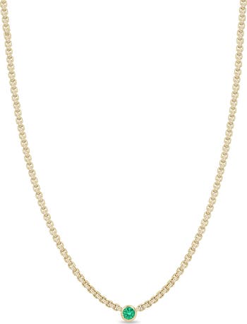 A single emerald bezel shines at the center of a pillowy box-chain necklace gleaming in 14-karat gold.