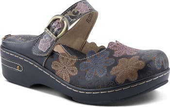 Brushed hardware and contrast stitching create visual intrigue on a floral-patterned mule set on a cushioned footbed and chunky platform sole.