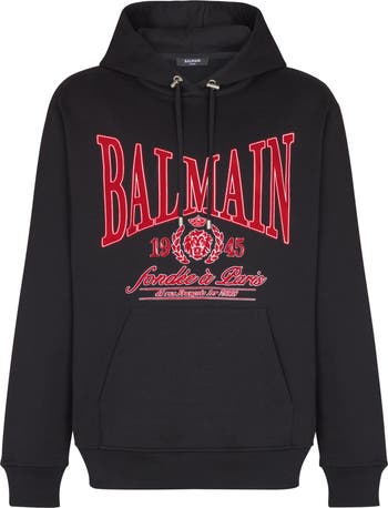 Cotton hoodie Drawstring and cord stopper Long sleeves Flocked Balmain College logo on the front Front kangaroo pocket Ribbed edging Regular fit Model measures 190cm and wears a size M Main material: 100% cotton Made in Portugal Item: FH0JT047GF25 100% of the cotton fibres used to make this garment are certified and organically farmed