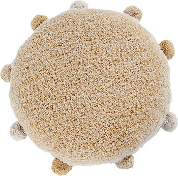 Round Floor Cushion in a soft, melange cotton blend, available in Natural & Honey, Natural & Olive, and Natural & Vintage Nude color combinations. Each cushion features 9 matching cotton pompons attached around the edges, adding a playful and cozy touch to any room.