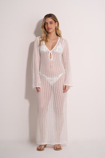 This stunning crocheted beach dress combines elegance with ease. Featuring long wide sleeves, a keyhole front, and a low scoop back, it’s perfect for adding a touch of sophistication to your beach day. The adjustable tie-back at the neck ensures a customizable fit, while the maxi length adds a flowy, feminine vibe.