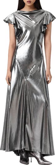 Liquid-shine metallic fabric defines this dramatic maxi dress designed with a drapey cowl neck and a floor-sweeping hem that moves with each step.