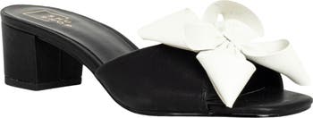 An architectural bow adds a fashion-forward aesthetic to a faux-leather slide sandal set on a low block heel for a stylish hint of height.