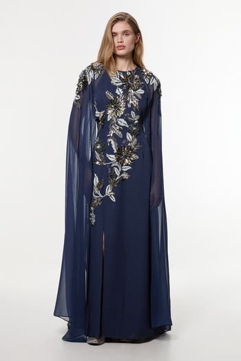 Dramatic cape sleeve design creates a flowing silhouette with elegant movement. Intricate 3d floral embellishments cascade down the front for a luxurious dimensional effect. High neckline offers sophisticated coverage perfect for formal occasions. Floor-length maxi cut with a subtle front slit for ease of movement. Sheer cape overlay adds theatrical flair whilst maintaining a refined aesthetic. Command attention at your next special event in this show-stopping maxi dress from karen millen.