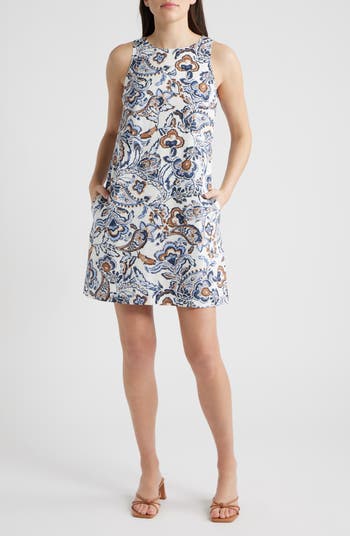 A lively mix of florals and paisley bring watercolor-inspired detail to this linen-enriched minidress designed in an A-line silhouette with side-seam pockets.