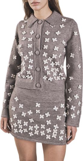 Prim meets playful in this shrunken-fit cardigan, where a scattered bouquet of softy sculpted flowers springs forth among polished details like fabric-covered buttons and a neat collar.