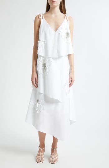 Light as air and made to turn heads, this layered-look cotton midi dress floats on delicate spaghetti straps and finishes with an asymmetrical hem for added movement. Three-dimensional floral appliqués with glittering rhinestone centers bloom across the silhouette, bringing texture, sparkle and standout charm.