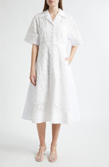 A midi shirtdress makes a striking statement with sculptural three-dimensional floral appliqués blooming across its fit-and-flare silhouette. An exaggerated notched collar and short sleeves and bold, modern contrast to this artful, romantic style.