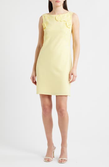 Tonal blooms alight upon a buttery sheath dress that's ready to charm the garden party circuit.