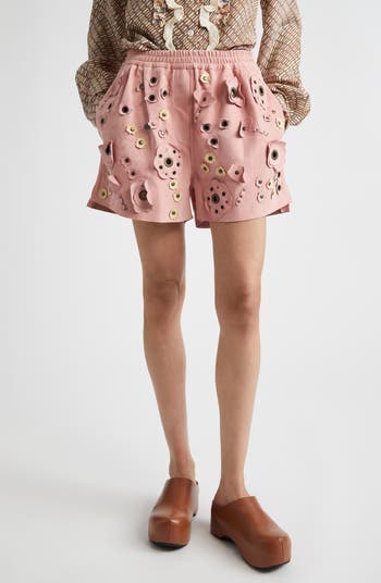 Bring a spring awakening to your wardrobe with these pull-on shorts made from supple pink suede and scattered with flower appliqués embellished with grommets and studs.