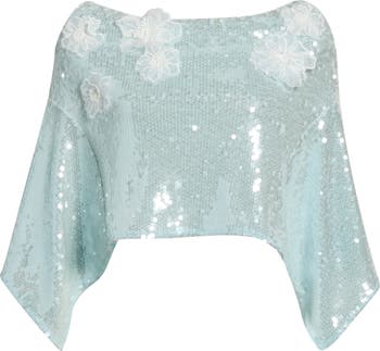 White blooms alight upon a shimmering backdrop in a fun-to-wear miniskirt drenched in dazzle and offered with a twirlable handkerchief hem.