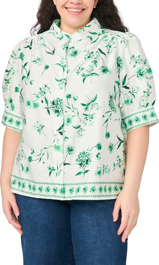 Freshen your weekday rotation in this stretch-cotton button-up shirt blooming in a delicate floral print and framed with a neat band collar and softly puffed sleeves.