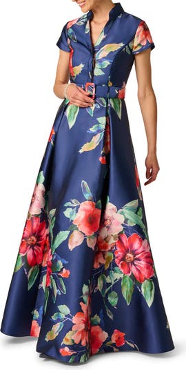 Oversized blooms bring vivid color to this stunning cap-sleeve Mikado gown designed with a face-framing mandarin collar and cinched at the waist with a wide belt.