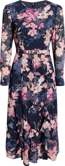 Vivid florals lend a painterly-inspired touch to this romantic midi dress cinched with a removable belt and finished with a ruffled skirt that moves with easy elegance.
