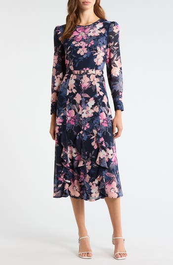 Vivid florals lend a painterly-inspired touch to this romantic midi dress cinched with a removable belt and finished with a ruffled skirt that moves with easy elegance.