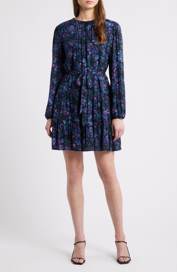 A removable tie belt defines the waist of this floral minidress topped with a softly gathered neckline and finished with a tiered ruffle hem.