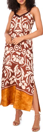 Border details trace the graceful silhouette of a satin maxi turned out in a captivating print.