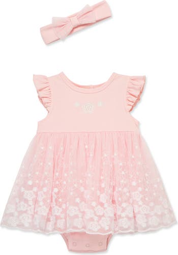 A precious matching headband crowns this cotton set featuring a skirted bodysuit boasting embroidered blooms that border the hem.