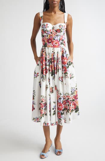 Floral Bouquet Print Pleated Poplin Fit & Flare Dress