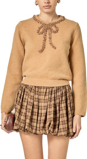 A flowery bow tops this crewneck sweater anchored by ribbed trim.