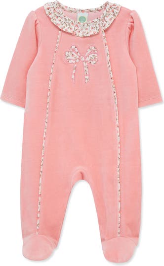 Treat baby to the cozy comfort of this plush velour footie tied up with a bow appliqué and ruffly neckline for added charm.