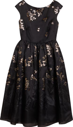 An elegant interplay of texture and tone, silhouette and shine, this fit-and-flare dress captures the shape and grace of mid-century fashion in metallic-detailed silk-blend brocade.
