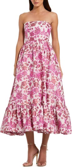 This brocade midi dress features a strapless square neckline, A-line silhouette, and ruffle hem, making it perfect for weddings or cocktail parties.