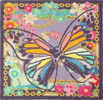 A striking butterfly motif takes center stage on this silk square bandana framed by colorful florals and graphic chain detailing.