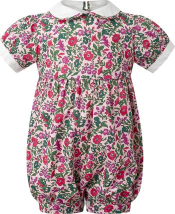 This adorable floral babysuit in lively pink and green tones is made for little ones who love to move and play. It features a sweet ivory Peter Pan collar and matching trims on the short sleeves for a charming touch. The short legs and roomy bottom ensure a comfy fit that lets your baby wiggle freely. Easy button closures at the back and inner leg make dressing and diaper changes simple. A playful and cozy outfit perfect for all your baby's adventures!