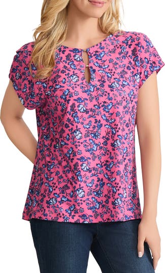 A pair of subtle goldtone accents draws the eye to the demure cutout at the neckline of this cap-sleeve top rendered in a pretty floral print.