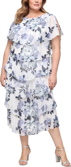 Enchanting flowers bloom across a romantic chiffon cocktail dress showcasing a fluttery capelet with rhinestone-dusted shoulders and a tiered ruffle skirt.