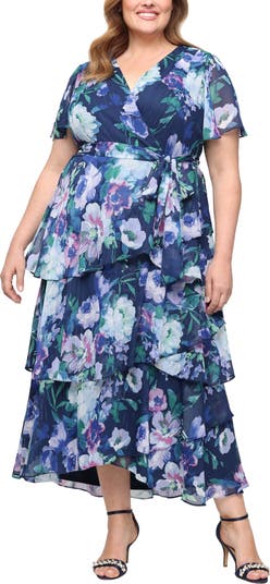 Luminous and light, this floral-print chiffon dress is woven with subtle metallic stripes that catch the light. A flattering surplice V-neckline and short sleeves frame the silhouette, while a softly tiered skirt adds graceful movement. The removable tie at the waist lets you define the shape to your liking.