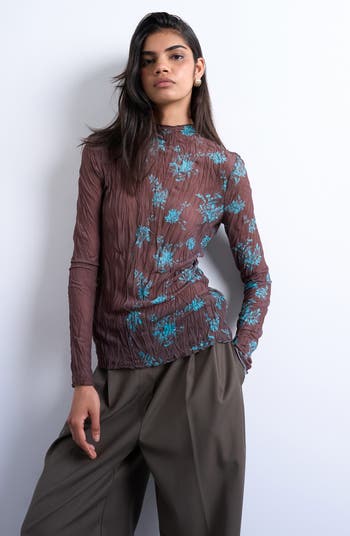 Crinkly texture and a juxtaposed solid hue bring personality to this mesh funnel-neck top.