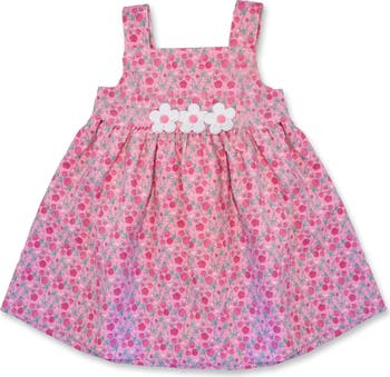 A cheerful twist on a classic, this jumper is crafted in pink floral printed corduroy with stretch; appliqué flowers at the front waist add charm, adjustable button straps and back spaghetti ties ensure fit, and a center-back zipper and shirred waist skirt finish the knee-length silhouette. Pink floral printed corduroy, 80% polyester 17% nylon 3% spandex, appliqué flowers at front waist, center-back zipper, adjustable button straps, back spaghetti ties, waist dress silhouette with shirred skirt, knee length.