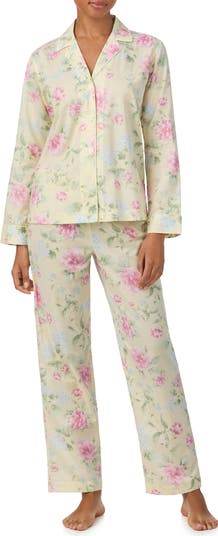 Luxe piping and an embroidered monogram polish up the look of these cozy pajamas featuring a floral button-up complete with matching straight-leg pants.