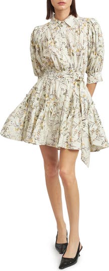 Romantic wildflowers bloom on this crisp, pleated cotton-poplin shirtdress designed with a defining D-ring belt and a ruffle hem.