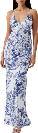 A striking mix of flora and fauna explode atop this maxi cover-up with a strappy, low-dipping back.