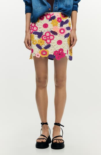 A colorful floral crochet pattern brings cheerful charm to this cotton-blend miniskirt. Designed in a straight silhouette, it sits smoothly at the waist and falls to a clean, easy shape that highlights the intricate openwork detailing.
