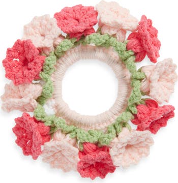 Toss up your tresses with an artisanal flourish with this crocheted scrunchie encircled with colorful flowers.