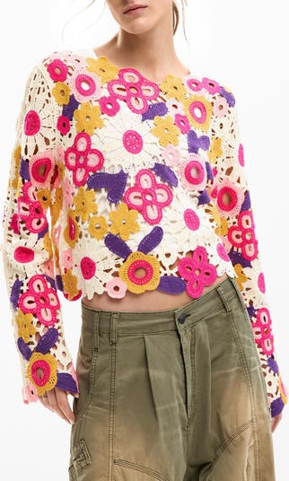 Floral and sheer, this cotton-blend sweater is a layerable favorite made with colorful crochet stitches.
