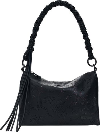 A perforated floral pattern and fringe add stylish whimsy to this faux-leather bag featuring a ruched top handle and adjustable crossbody strap for versatile carry.