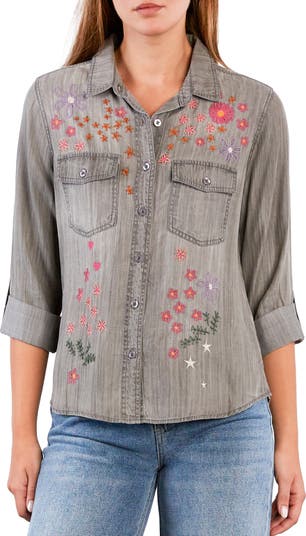 Embroidered flowers, hearts and stars add to the retro vibe of this lightweight button-up denim shirt.