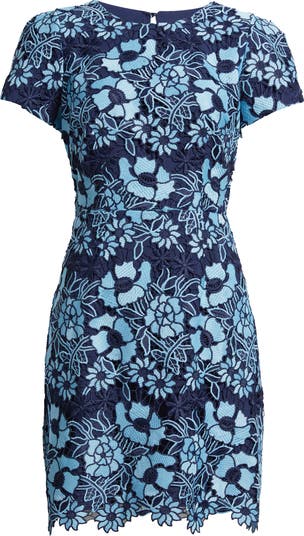 Denim embroidery overlays this fitted minidress finished with a scalloped hem that brings charming detail to the silhouette.