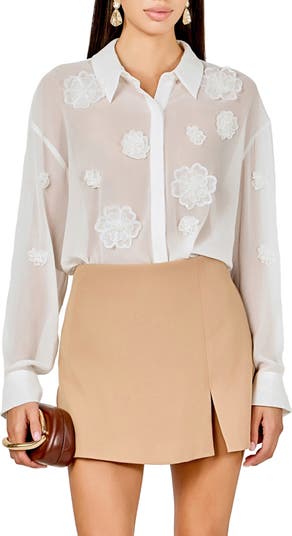 Lustrous 3D blooms add enchantment to this drop-shoulder shirt cut from sheer fabric.